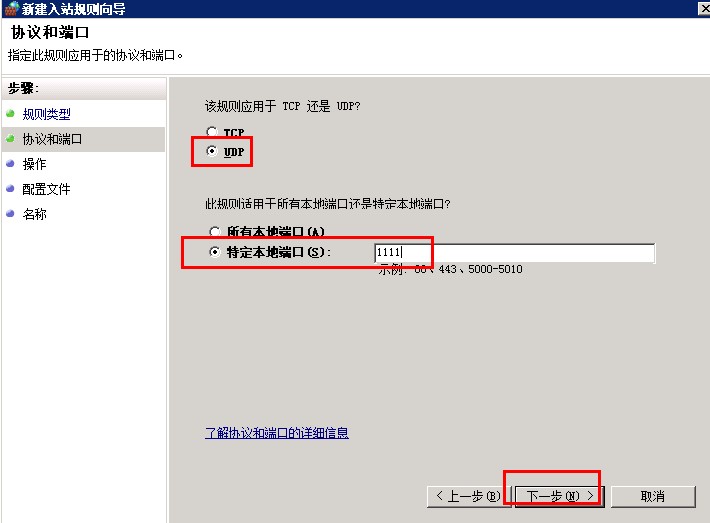 点击添加以后会提示下一步,点击下一步后,描述里面填写udp描述,示例以1111为例